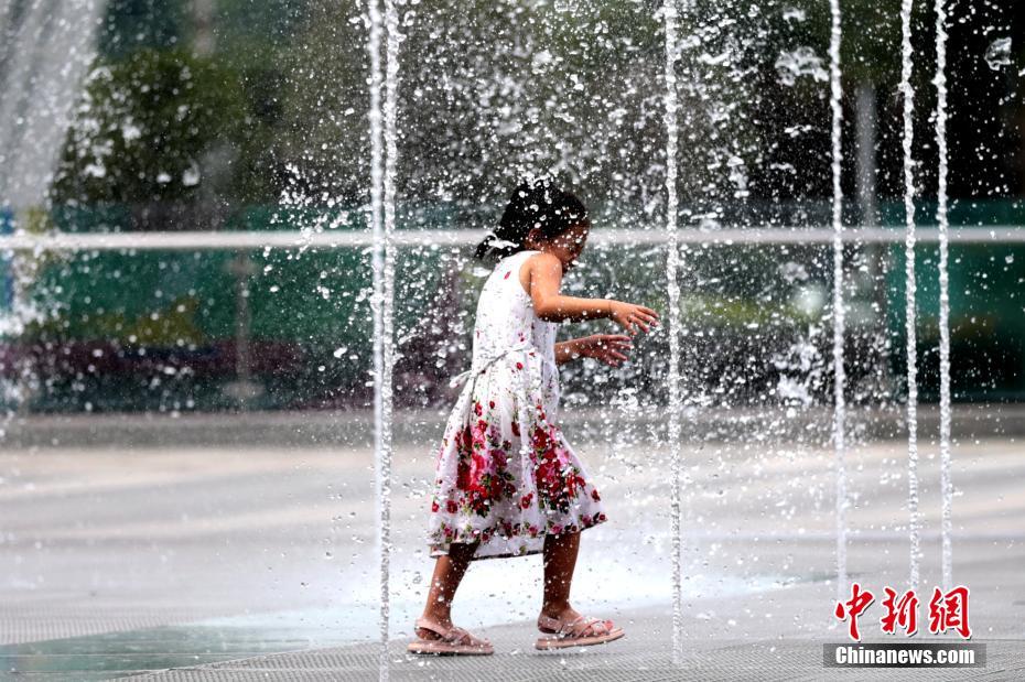7月15日,西安市气象台继续发布高温橙色预警信号,预计未来24小时内西安城区及周边县区大部分地方最高气温将升至37℃以上。图为小朋友在西安一广场喷泉内玩耍。中新社记者 张远 摄