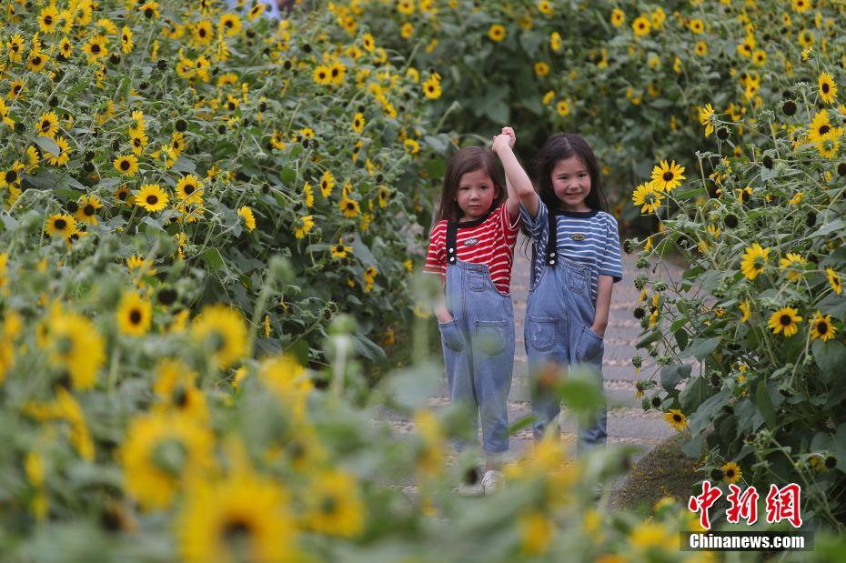 7月16日,小游客在上海南园滨江绿地观赏盛开的向日葵。当日,正处梅雨季节的上海阴雨暂歇,不少市民和游人来到公园绿地赏花拍照。中新社记者 张亨伟 摄