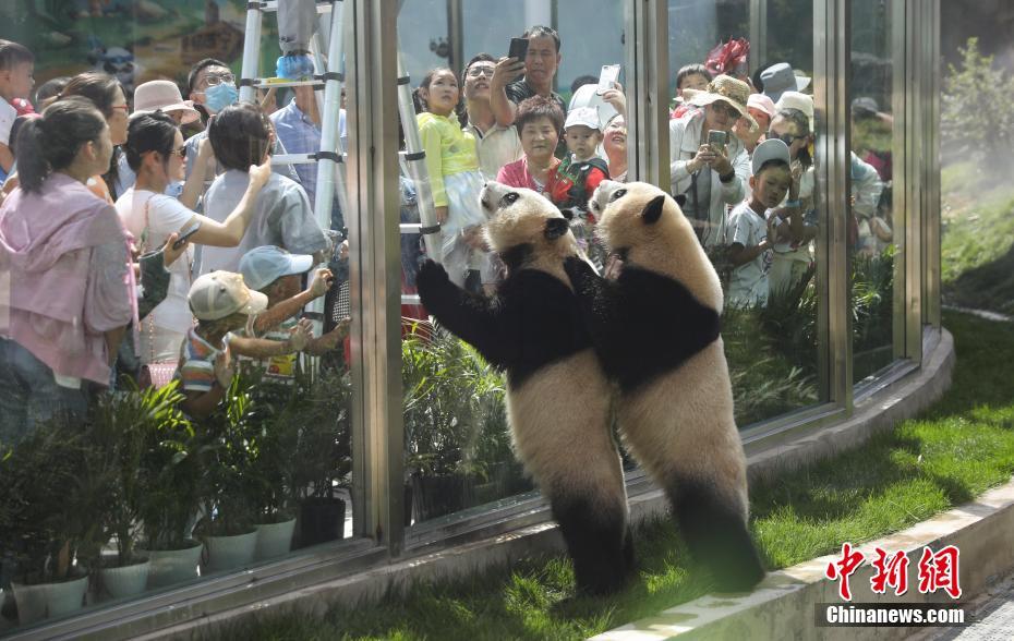 7月16日,青海西宁,大熊猫“奇果”和“园满”撒欢卖萌,吸引众多游客。位于西宁的青藏高原野生动物园内的熊猫馆总占地面积9000平方米,场馆面积4617平方米,是目前中国国内最大的单体熊猫馆。中新社记者 赵隽 摄