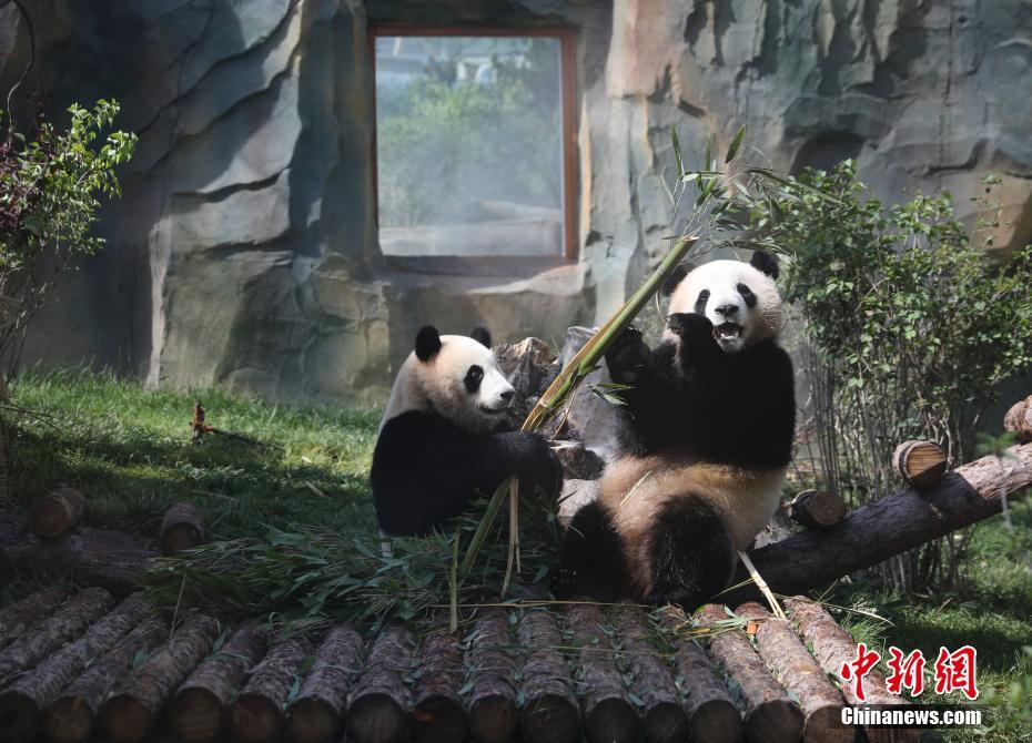 7月16日,大熊猫“奇果”和“园满”啃食竹子、撒欢卖萌。位于西宁的青藏高原野生动物园内的熊猫馆总占地面积9000平方米,场馆面积4617平方米,是目前中国国内最大的单体熊猫馆。中新社记者 赵隽 摄