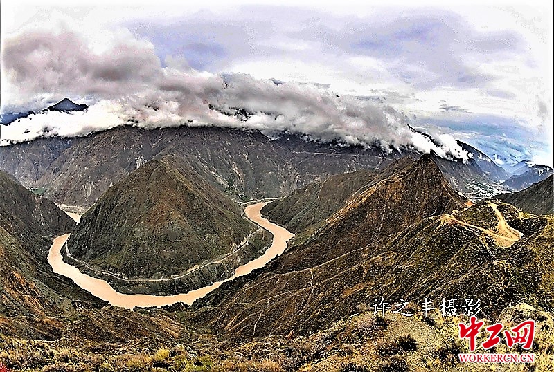中工网讯 金沙江是中国第一大河长江的上游。因江中沙土呈黄色得名。金沙江穿行于川、藏、滇三省区之间。金沙江第一弯,位于云南省徳钦县奔子栏镇和四川省得荣县庚乡交界处,当地人称为月亮湾。由北向南纵贯全境的定曲河,在先后接纳了玛伊河和硕曲河之后,携三江之水投入了金沙江的怀抱在江水汇合处,形成“三壁夹两江”的奇景,围绕着金字塔般的日锥峰潇洒地画了一个“Ω”字形的大拐弯,竟成就了一处奇观。图为2019年7月9日的滇西金沙江两岸。工人日报-中工网许之丰摄影报道