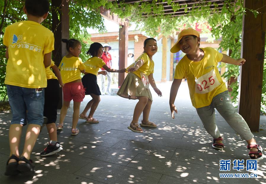 7月21日,暑期爱心托管班的孩子们在研学活动间隙做游戏。 日前,由浙江省诸暨市教育工会和诸暨市店口镇中心学校等单位共同举办的店口镇企业员工子女暑期爱心托管班正式开班。为期一个月的暑期爱心托管班针对店口镇企业众多、部分员工暑期照看子女存在困难的实际情况,为来自全国10多个省份的280多名企业员工子女提供暑期辅导,并组织研学、文体活动等,让孩子们开心过暑假。 新华社记者 韩传号 摄