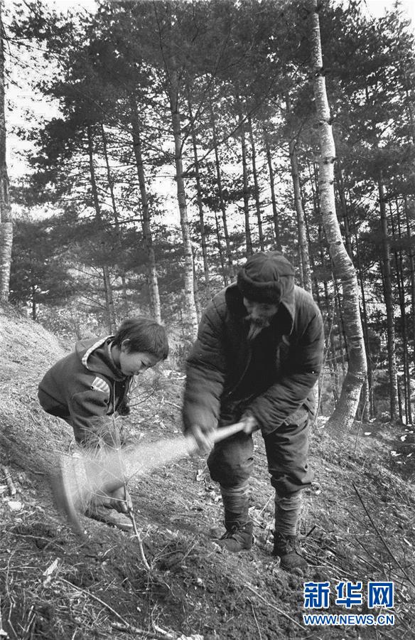 春季开学时,姚武臣老人带着曾孙姚祖元(左)在姚家纪念林栽种一棵小树(1996年2月摄)。新华社记者 陶明 摄