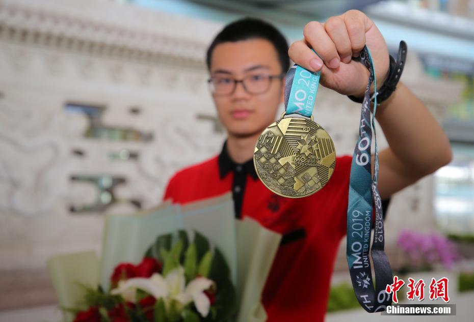 7月23日,摘得金牌的少年展示国际数学奥林匹克竞赛(IMO)金牌。当日,6位代表中国重登国际数学奥林匹克竞赛(IMO)冠军宝座的少年载誉回国。第60届国际数学奥林匹克竞赛(IMO)今年在英国巴斯市成功举办。这是全球最负盛名的中学生数学竞赛,中国代表队以227分的总成绩与美国队并列世界第一。在本次比赛中,中国诞生了2名满分选手,且6名队员均摘得金牌,也是8年来中国队员再次全部摘金。中新社记者 杨可佳 摄