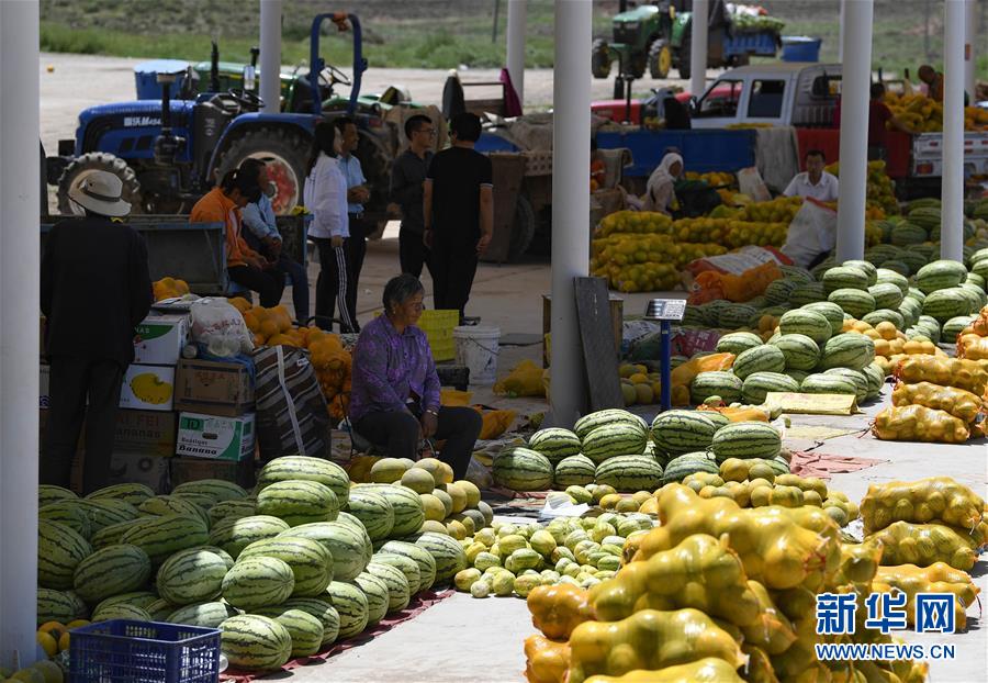 7月23日,宁夏中宁县喊叫水乡的瓜农在集市上售卖瓜果。新华社记者 冯开华 摄