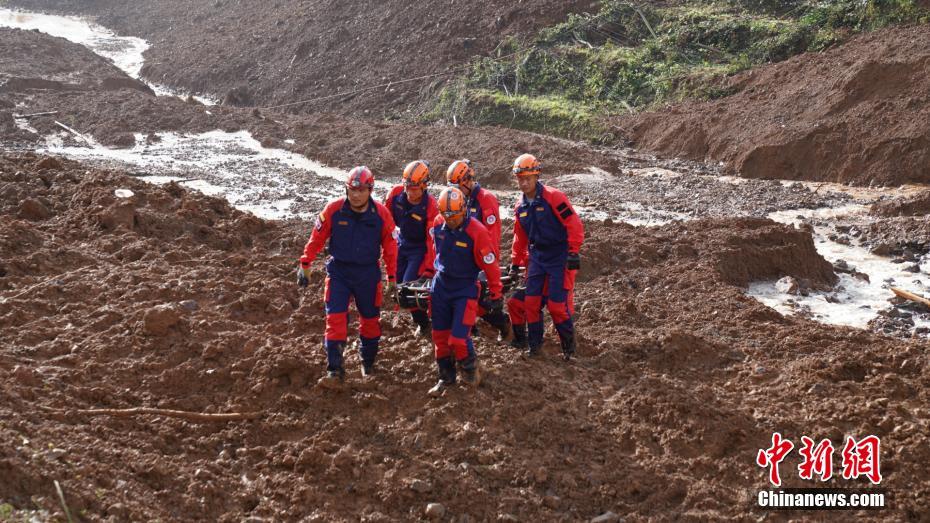 截至24日6时,贵州省消防救援总队247名指战员、9支矿山救护队257人、贵阳隧道救援队56人,携带搜救犬、生命探测仪已到达现场开展处置。救援队伍到达现场后立即进行地毯式搜索定位,设立警戒区和安全哨,并将现场划分为5个救援点,采取挖掘、破拆、撑顶等方式开展抢险救援。图为贵州省消防救援队伍展开救援。 消防供图