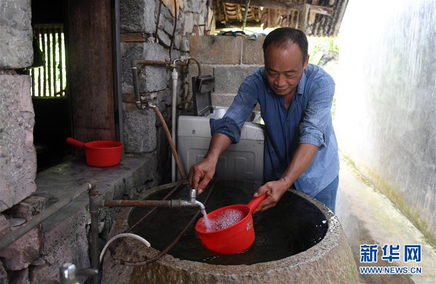 在广西都安瑶族自治县龙湾乡琴棋村琴岭屯,村民马瑞平在接取从建在山间的水柜里引来的自来水(7月23日摄)。新华社记者 陆波岸 摄
