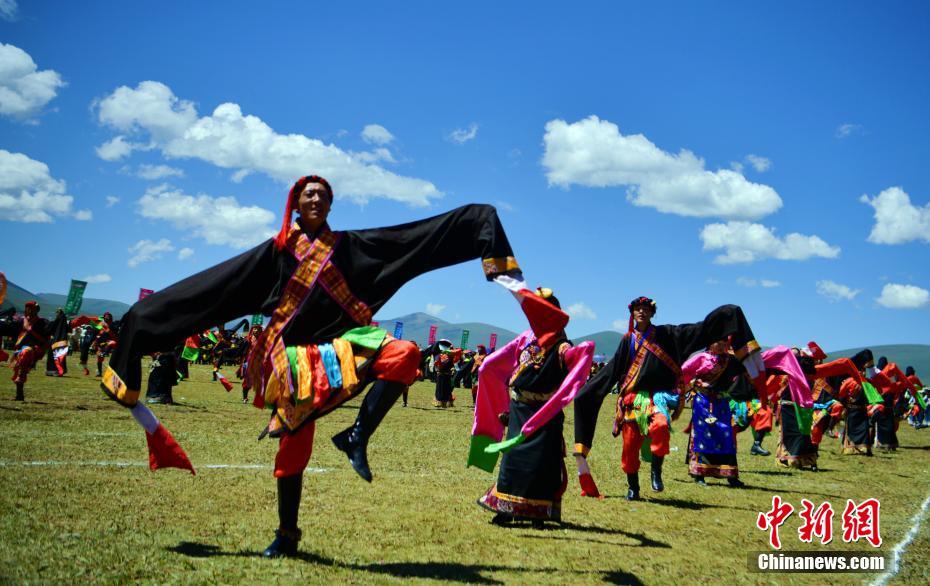 7月26日,民众在帐篷节上表演锅庄舞。当日,“石渠太阳部落帐篷狂欢节”在四川省石渠县开幕,当地藏族民众穿着节日盛装与海内外游客齐聚一堂,欢度节日。中新社记者 刘忠俊 摄