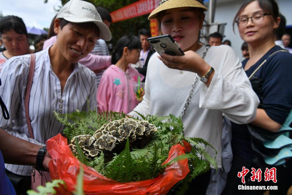 7月26日,游客围观获奖的干巴菌。当日,云南省宜良县狗街镇举办干巴菌菌王评比,对参赛选手所拾干巴菌按照单朵重量、品质、品相进行评定,并以每公斤1680元(人民币)起的价格进行义卖,吸引游客围观。中新社记者 任东 摄