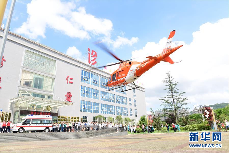 7月26日,在贵州省六盘水市首钢水钢总医院,救援直升机运送在山体滑坡灾害中受重伤的儿童周线胜前往贵州省人民医院进行后续治疗。新华社记者 杨楹 摄