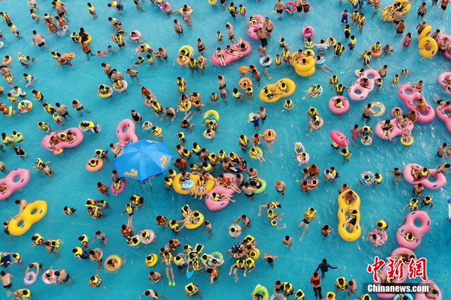航拍天目湖水世界冲浪池,人头攒动。何建 摄
