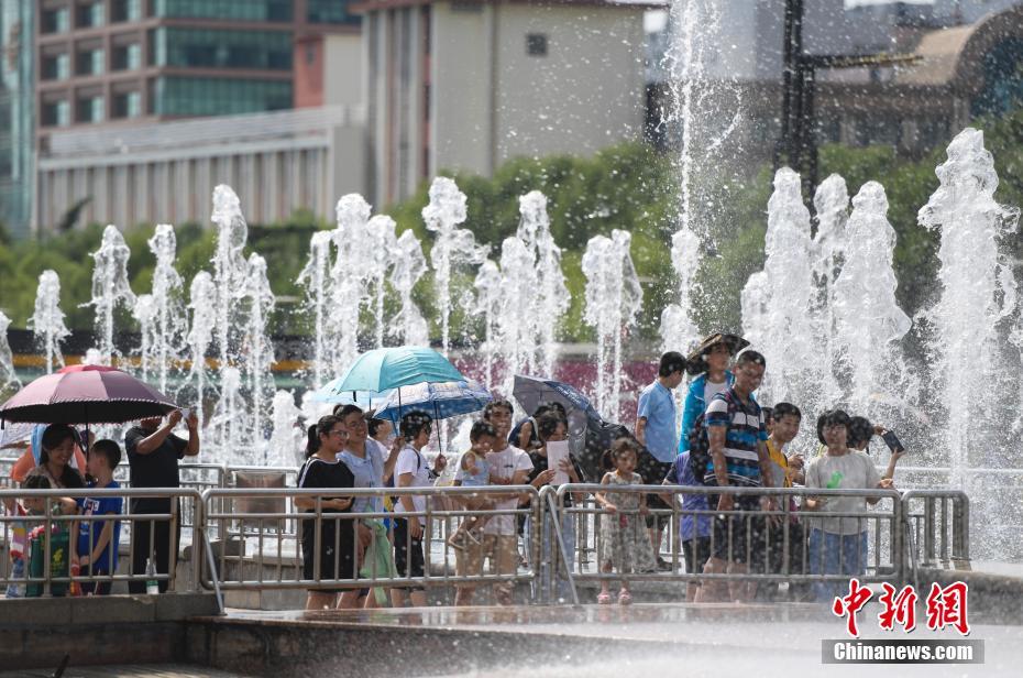 7月28日,民众在喷泉边避暑纳凉。当日,济南市气象台发布高温橙色预警信号。中新社记者 张勇 摄