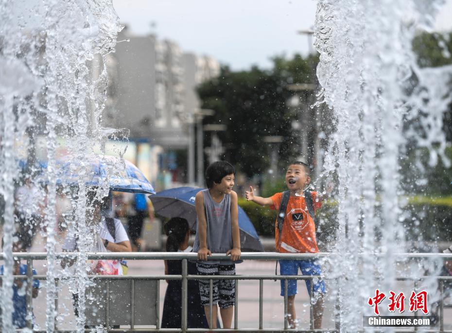 7月28日,儿童在喷泉边避暑纳凉。当日,济南市气象台发布高温橙色预警信号。中新社记者 张勇 摄