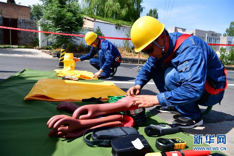 7月30日,在河南省新安县正村镇上坡村,尤宁(左)和同事一起做带电作业前的准备工作。