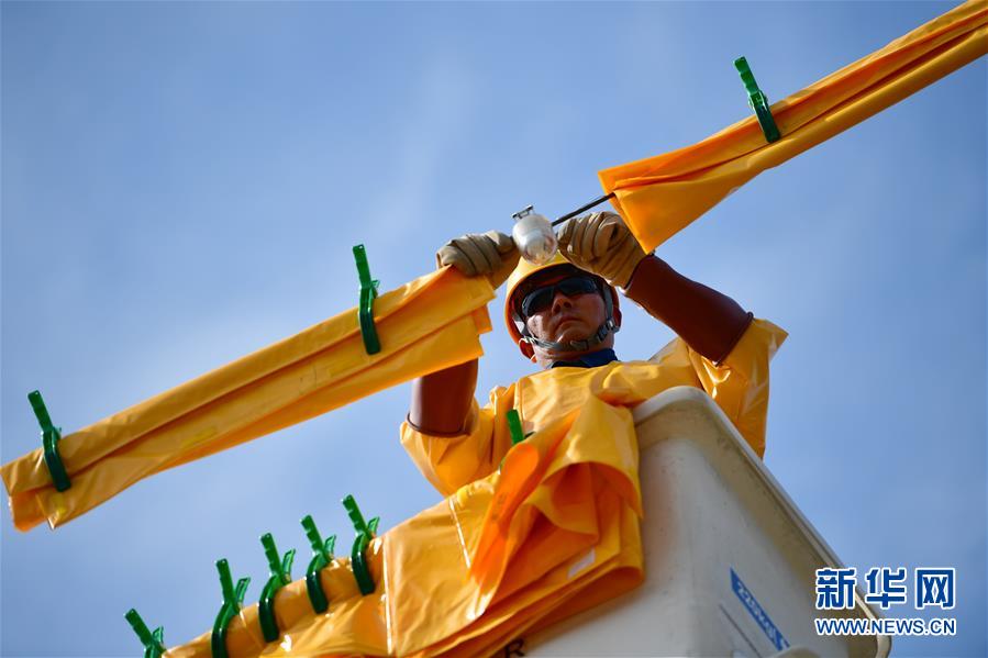 7月30日,在河南省新安县正村镇上坡村,尤宁在进行带电作业。 新华社记者 冯大鹏 摄