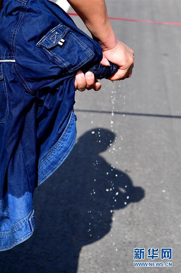 7月30日,在河南省新安县正村镇上坡村,尤宁结束带电作业后,所穿的工作服中拧出了水。 新华社记者 冯大鹏 摄