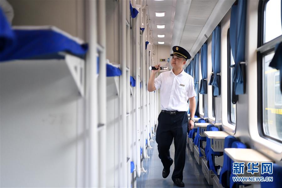 7月31日,在重庆车辆段重庆西动车所车库里的K358次列车上,守车列车长徐波在硬卧车厢内进行巡视。 为保证一线客运班组职工有充分的休息时间,重庆客运段在暑运期间临时抽调各车队骨干设立“守车列车长”这一特殊岗位,负责对停放在车库的列车进行检查巡视。作为这样一名列车长的徐波不跟车也不和任何旅客见面。他要对停放车库的列车进行包括检查车门、防火防爆、检查列车隐蔽部位、列车保洁质量验收、接收清点列车备品物资、配合车辆检修等方面的工作。 一趟列车在车库里往往会停留30个小时以上,绝大部分时间处于无电状态。在重庆夏日太阳的炙烤下,列车车厢内温度经常会突破50度,徐波则需要在这样的“桑拿”环境下连续作业,保证每一趟始发列车的安全与整洁,确保列车在执行下一次旅客运输任务时能够保持高标准的整备状态。 新华社记者 唐奕 摄