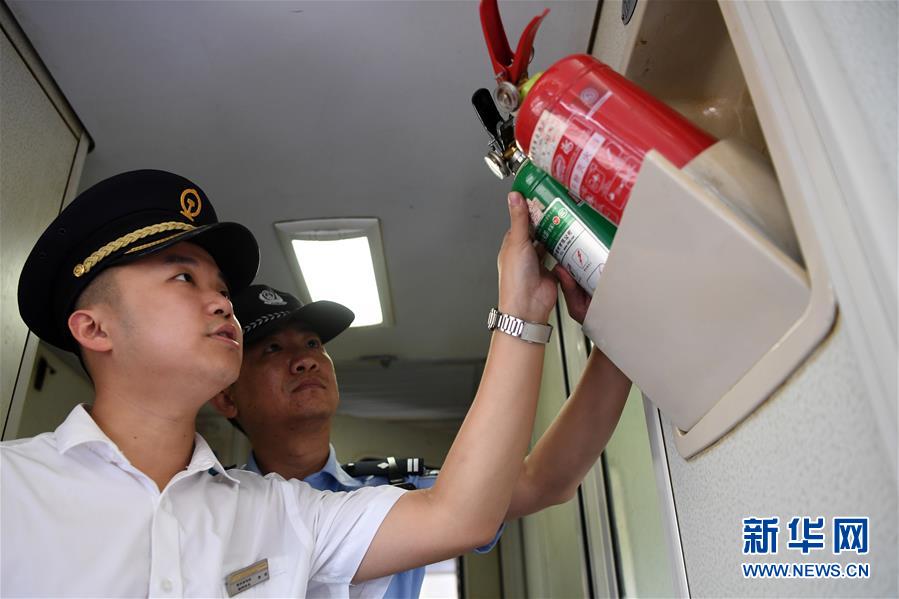 7月31日,守车列车长徐波(左)与重庆铁路公安处民警在车厢内进行列车消防检查。 为保证一线客运班组职工有充分的休息时间,重庆客运段在暑运期间临时抽调各车队骨干设立“守车列车长”这一特殊岗位,负责对停放在车库的列车进行检查巡视。作为这样一名列车长的徐波不跟车也不和任何旅客见面。他要对停放车库的列车进行包括检查车门、防火防爆、检查列车隐蔽部位、列车保洁质量验收、接收清点列车备品物资、配合车辆检修等方面的工作。 一趟列车在车库里往往会停留30个小时以上,绝大部分时间处于无电状态。在重庆夏日太阳的炙烤下,列车车厢内温度经常会突破50度,徐波则需要在这样的“桑拿”环境下连续作业,保证每一趟始发列车的安全与整洁,确保列车在执行下一次旅客运输任务时能够保持高标准的整备状态。 新华社记者 唐奕 摄