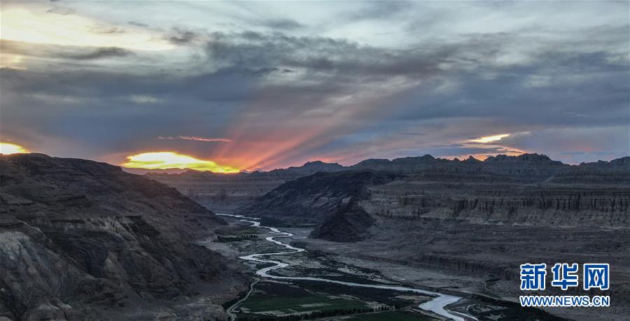 夕阳余晖下,古格王国遗址旁的河流(7月30日无人机拍摄)。 古格王国遗址位于西藏阿里札达县境内。偏远的地理位置、神奇的土林地貌和灿烂的古格文明,使得阿里古格王国遗址旅游成为了西藏深度旅游的一个重要组成部分。 新华社记者 晋美多吉 摄