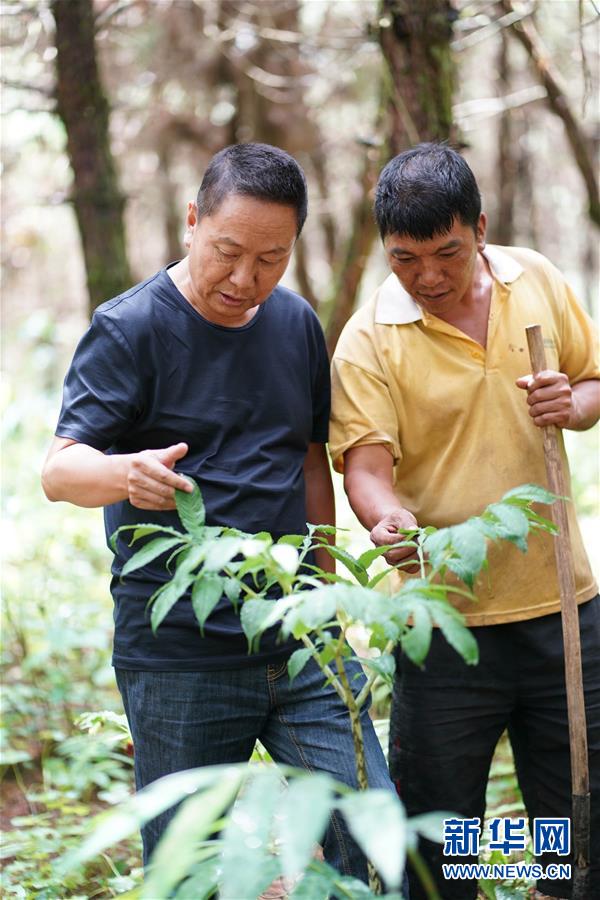 张林波(左)和林场工人一起查看林场中的植物(7月31日摄)。 位于云南省景洪市嘎洒镇的大黑山林场,曾经是杂草丛生的荒山。1993年,林场主张林波带领当地村民承包这片约2万亩的荒山,开始垦荒种树。20多年时间里,林场累计完成人工种植14000多亩,先后植树400余万株。2016年,大黑山林场被云南省林业厅认定为“景洪嘎洒省级森林公园”。 如今的大黑山林场,森林覆盖率已达86.9%。荒山变美了,林场还为周边村寨的群众无偿提供杉木种苗,扶持群众造林3万余亩,同时指导村民发展林下产业。 新华社记者 秦晴 摄