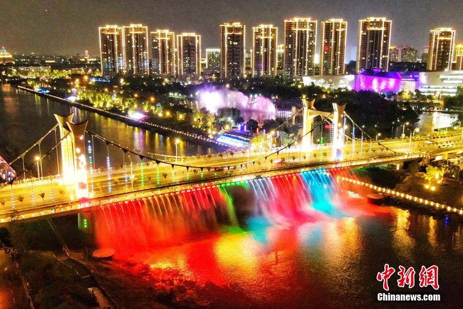 8月4日晚,位于南京江宁杨家圩的“网红”小龙湾桥桥身两侧喷射出一道道水柱,时而抛向天际时而射向水面,通过光变幻出紫、红、蓝、绿等多重色彩,炫目迷人点亮夜空。
