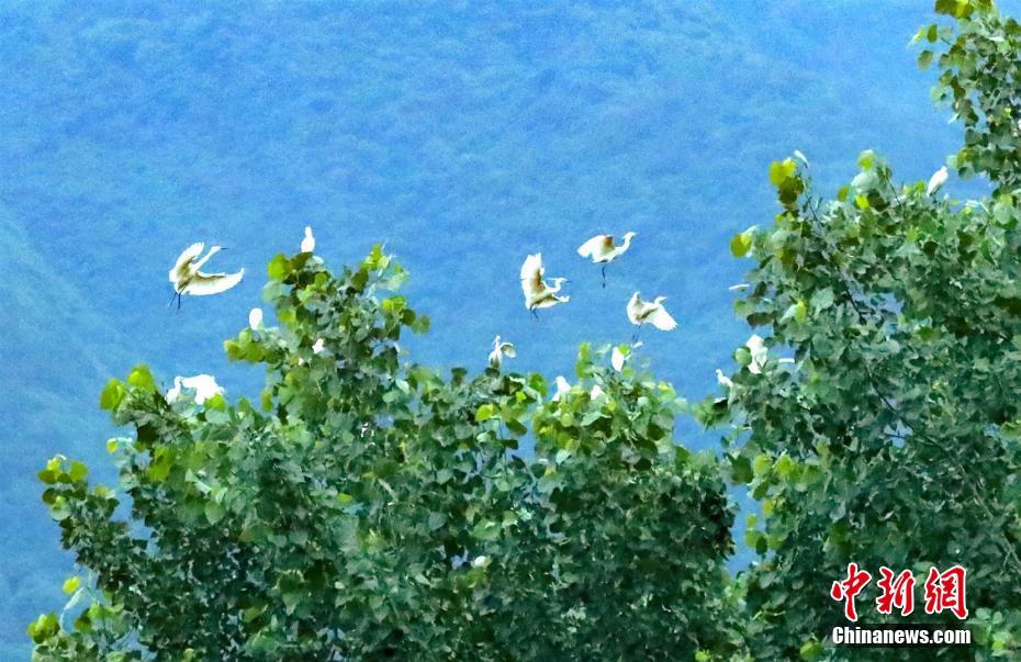 盛夏时节,三峡库区湖北省秭归县童庄河水清岸绿,白鹭或在林间飞舞鸣唱,或在河道上空结伴掠过,构成了一幅生态美景图。王罡 摄