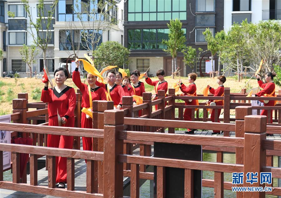 8月5日,埭溪镇小羊山村村民腰鼓队在村里的曲桥上排练。新华社记者 翁忻旸 摄