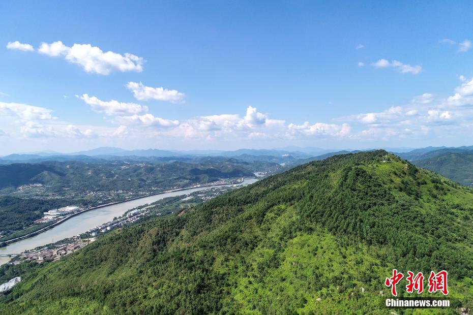 8月5日,航拍镜头下的广东省梅州市明珠冶炼厂旧址与称子岌山。10多年前,称子岌山由于受到明珠冶炼厂排放物的污染,导致长期荒山秃顶,岩石裸露。目前,当地政府关闭冶炼厂,对山体进行生态修复,称子岌山重新披“绿装”,植被已基本恢复。中新社记者 陈骥旻 摄