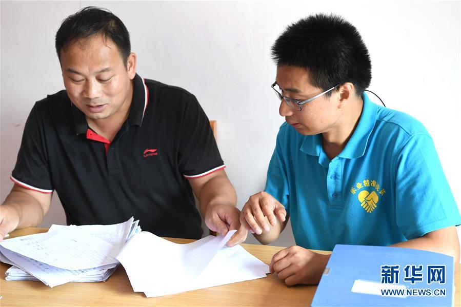 杨杰兴(右)在广西乐业县百坭村村委会办公室和同事商量工作(8月1日摄)。新华社记者 周华 摄