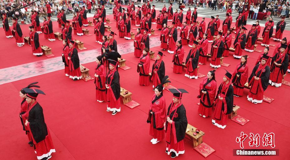 8月6日,中国传统“七夕”佳节来临之际,50对身着传统服饰的新人在河北定州举行汉式婚礼,再现了一场古老的婚俗。图为婚礼现场。中新社记者 翟羽佳 摄