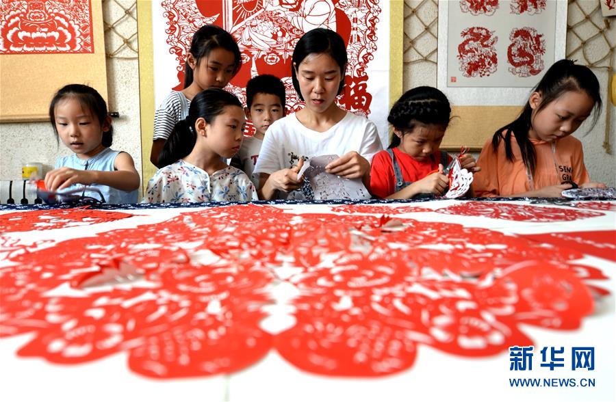 8月8日,剪纸艺人殷玲玲为孩子们讲解剪纸知识。 暑假期间,河北省磁县剪纸艺人殷玲玲开办“暑假免费学剪纸”兴趣班,向孩子们教授剪纸技艺,让孩子们学习创作各式剪纸作品,感受传统文化,乐享假期生活。 新华社记者 王晓 摄