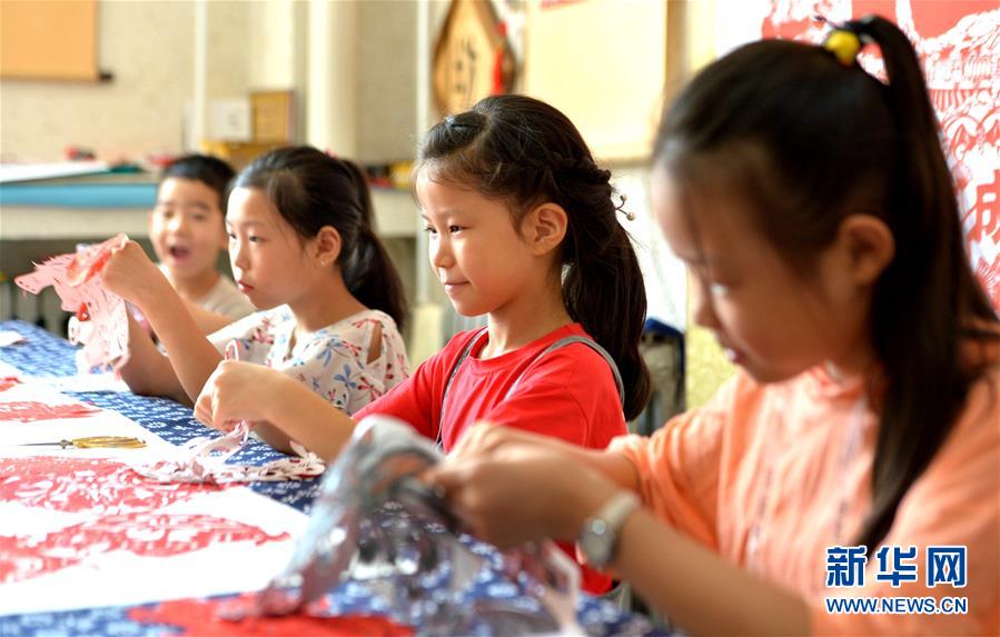 8月8日,孩子们在制作剪纸作品。 暑假期间,河北省磁县剪纸艺人殷玲玲开办“暑假免费学剪纸”兴趣班,向孩子们教授剪纸技艺,让孩子们学习创作各式剪纸作品,感受传统文化,乐享假期生活。 新华社记者 王晓 摄