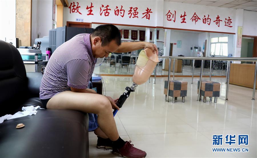 8月8日,残疾人陶国金在装配黄水根为他量身定制的假肢。 新华社记者 方喆 摄