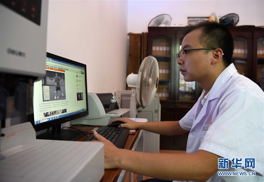 8月8日,黄水根在网上查阅各类型假肢制作的资料。 新华社记者 杨冠宇 摄