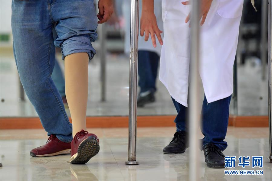 8月8日,黄水根(右)指导装配假肢的残疾人陶国金进行训练。 新华社记者 彭昭之 摄