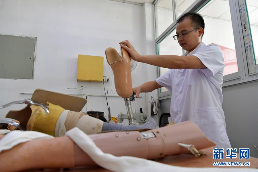 8月8日,黄水根对送来修复的假肢进行矫正。 新华社记者 彭昭之 摄