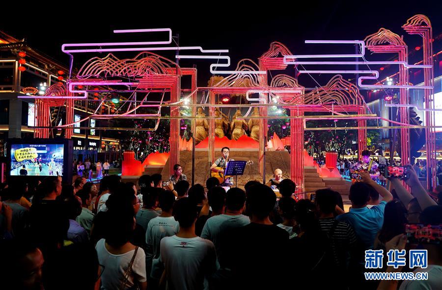 8月8日,游客在西安曲江大唐不夜城内观看音乐演出。 新华社记者 刘潇 摄