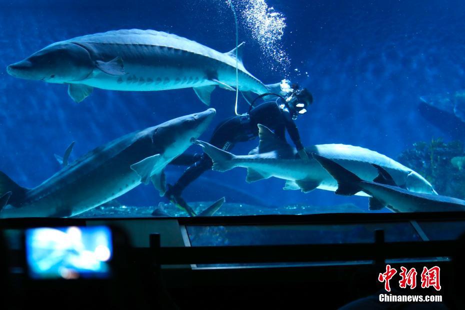 图为工作人员在水下对中华鲟进行体检。中新社记者 富田 摄
