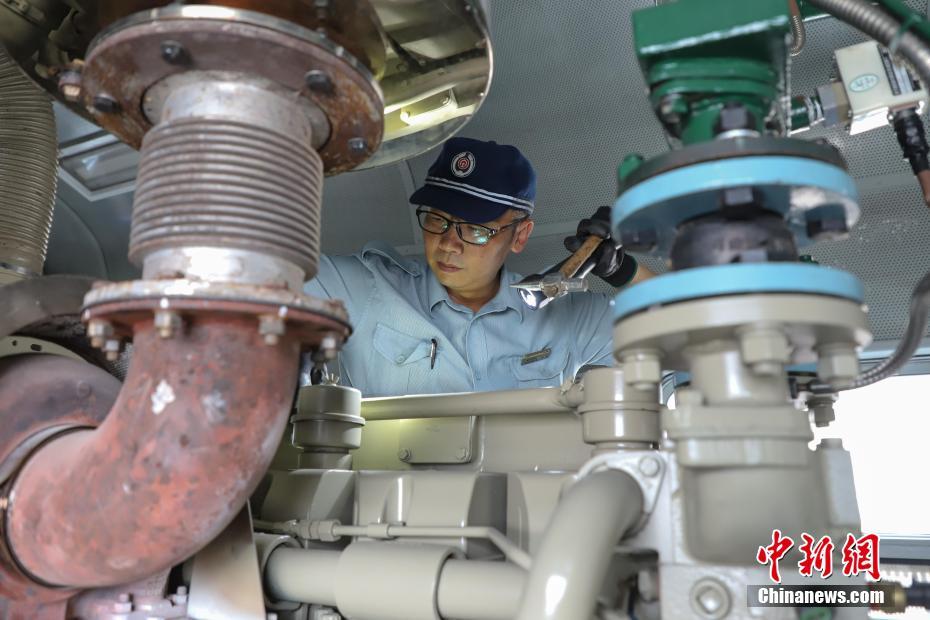 8月9日,检修工郑毅正在空调发电车内检查柴油发电机。当日,为保障列车运行途中空调正常使用,贵阳车辆段乘务车间动力班的发电车检修工对完成值乘任务和驻场的列车空调发电车进行全面检修。进入暑运以来,贵州省持续高温,发电车检修工每天都会冒着室外30℃、室内平均50℃的高温对空调发电车进行检修,确保空调、照明等服务旅客设备设施正常使用,让旅客舒适出行。中新社记者 瞿宏伦 摄