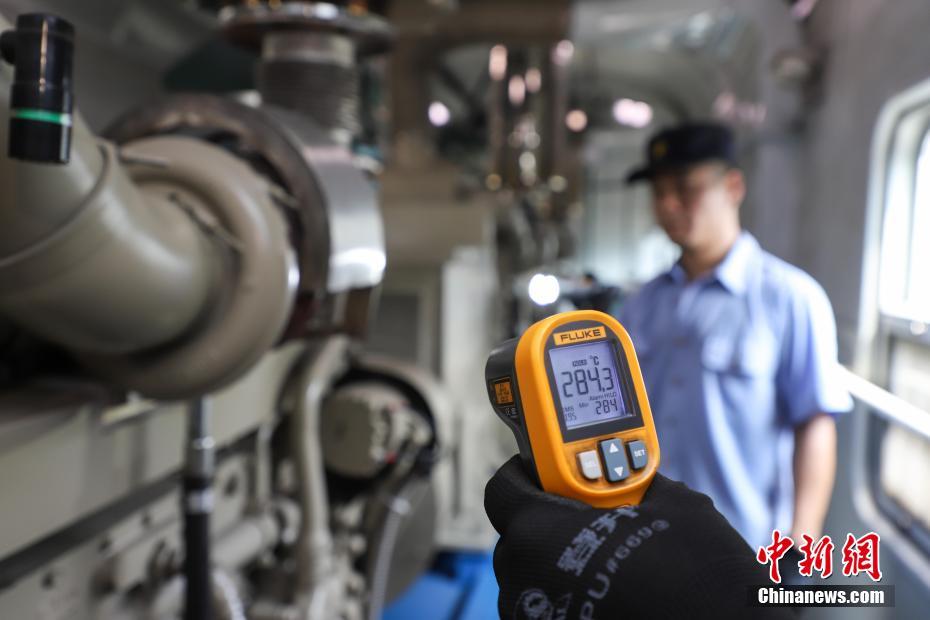 8月9日,为保障列车运行途中空调正常使用,贵阳车辆段乘务车间动力班的发电车检修工对完成值乘任务和驻场的列车空调发电车进行全面检修。进入暑运以来,贵州省持续高温,发电车检修工每天都会冒着室外30℃、室内平均50℃的高温对空调发电车进行检修,确保空调、照明等服务旅客设备设施正常使用,让旅客舒适出行。图为空调发电车内柴油发电机涡轮增压温度达到284.3℃。中新社记者 瞿宏伦 摄