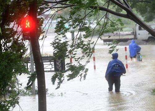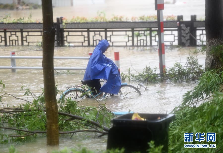 8月10日,一名女子推着自行车走在浙江温岭市区一条积水道路上。