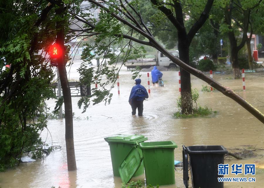 8月10日,行人在浙江温岭市区一条积水道路行走。