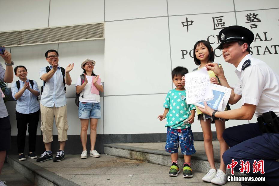 8月10日,“守护香港大联盟”当天在香港各区发起“全民撑警日”活动,呼吁市民携同亲友前往附近警署,向警队送上心意卡或慰问信,向警务人员表达慰问和支持。图为小朋友也送上慰问卡和中区警署戴警官合影。中新社记者 洪少葵 摄