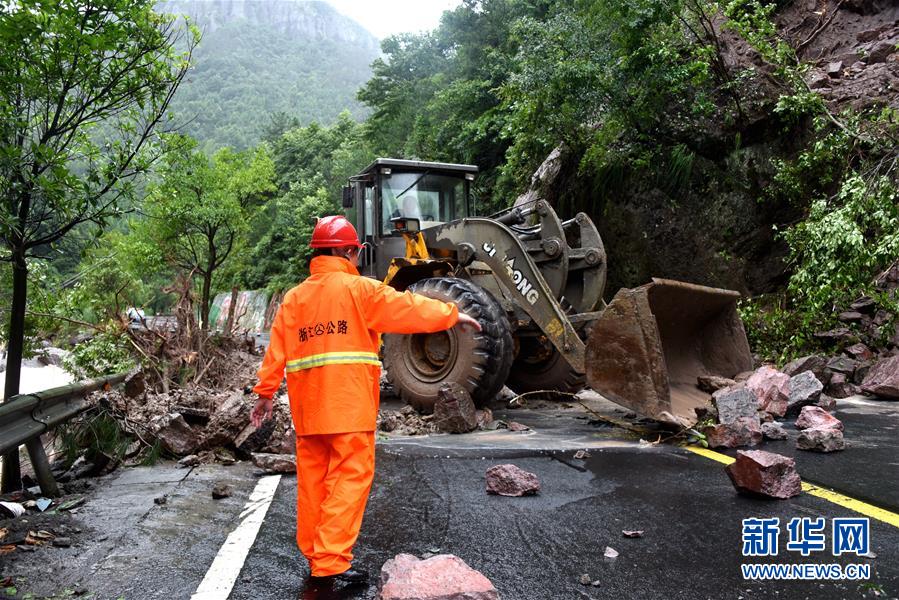 8月10日,在浙江省仙居县步路乡,公路部门工作人员在清除塌方。 今年第9号台风“利奇马”已于10日在浙江省温岭市沿海登陆。浙江各地组织力量,积极展开救援、灾后清理等工作。 新华社发(王华斌 摄)
