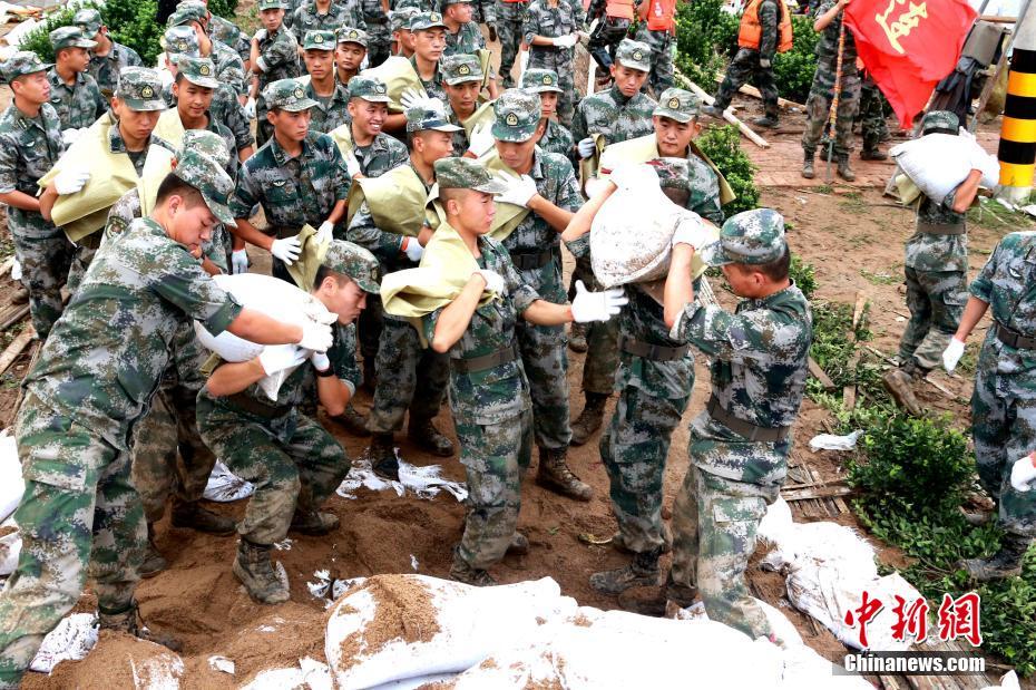 8月13日,1000余名救援人员手拿肩扛,将沙袋、木板等救援物资步行运至近一公里外的大坝决堤处。受超强台风“利奇马”影响,被誉为“中国蔬菜之乡”的山东寿光及周边县市自8月10日起普降特大暴雨,灾情较为严重。12日18时许,寿光市弥河羊口镇西堤出现缺口,千余军民共同封堵缺口,加固河堤。中新社记者 梁犇 摄