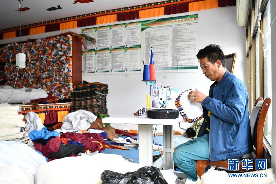 四季吉祥村村民创业代表边巴桑杰在制作藏式装饰盒(8月8日摄)。新华社记者 李鑫 摄