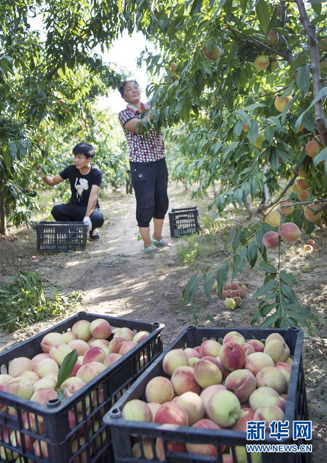 8月15日,青阳岔镇高石崖村村民张锦丽一家在桃园采摘桃子。新华社记者 陶明 摄