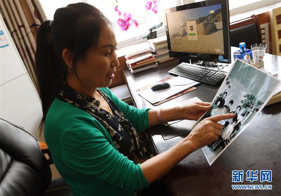 7月27日,甘肃省迭部县妇幼保健计划生育服务中心主任唐玉玲拿着家庭合影追忆父亲唐明军。 新华社记者 马宁 摄