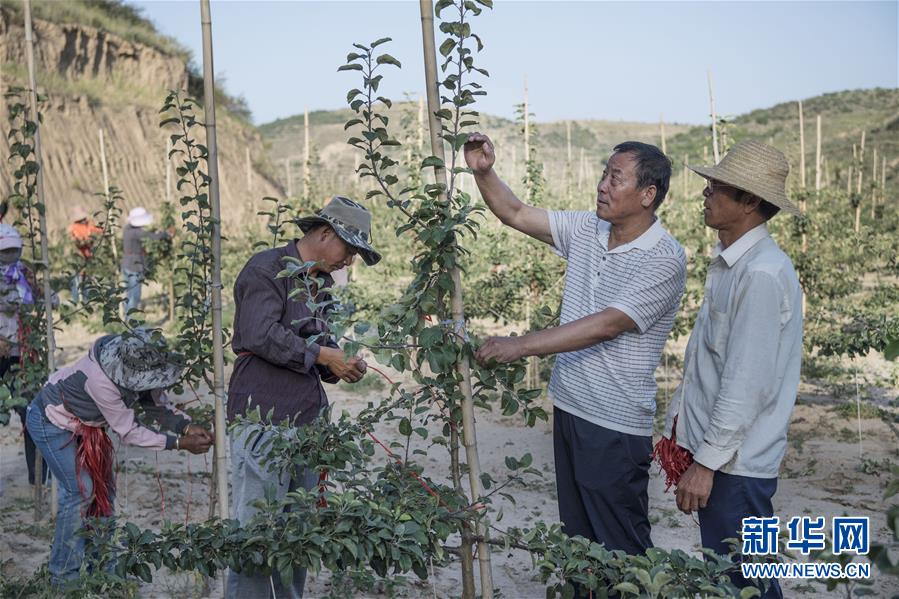 8月17日,李树和(右二)和村民们一起管理苹果园。在他林场务工的村民一天可领130元的工钱。 新华社记者 陶明 摄