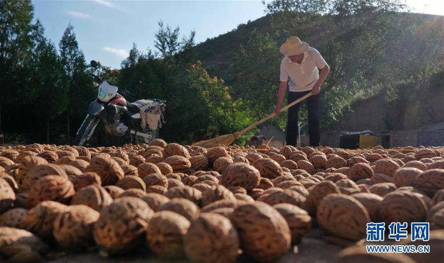 8月17日,李树和在翻晒山桃核。他栽下的6000亩山桃林,一部分已经挂果。 新华社记者 陶明 摄